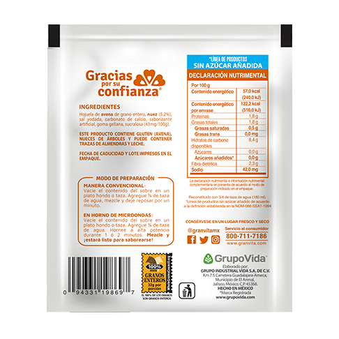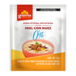 Avena integral de preparación instantánea sabor miel con nuez sin azúcar añadida, en su práctica presentación en sobre de 35g.