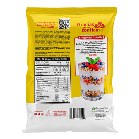 Delicioso cereal granola conformado por una mezcla de hojuelas de avena tostada, trigo, nueces, almendras, cacahuates, miel, pasas y trocitos de papaya deshidratada, en presentación de 800 g.