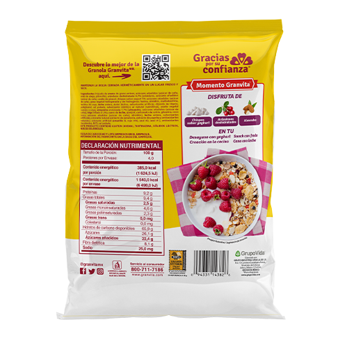 Granola hecha con miel natural de abeja, avena, trigo y una deliciosa combinación de frutos rojos deshidratados.