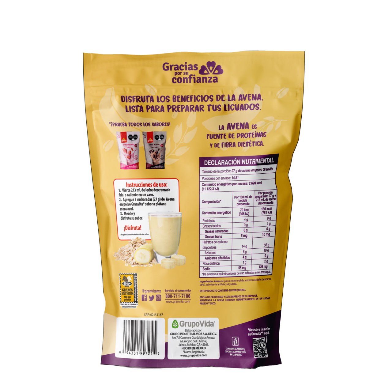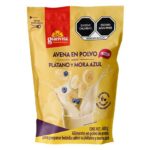 Avena en polvo para preparar bebida sabor Plátano y Mora Azul en presentación de 400 g.