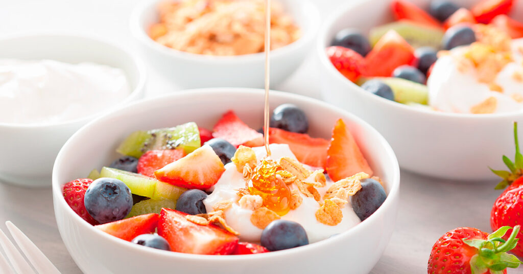 - Desayuna delicioso con un parfait de fruta y granola, una opción rápida y llena de sabor para empezar el día con energía.